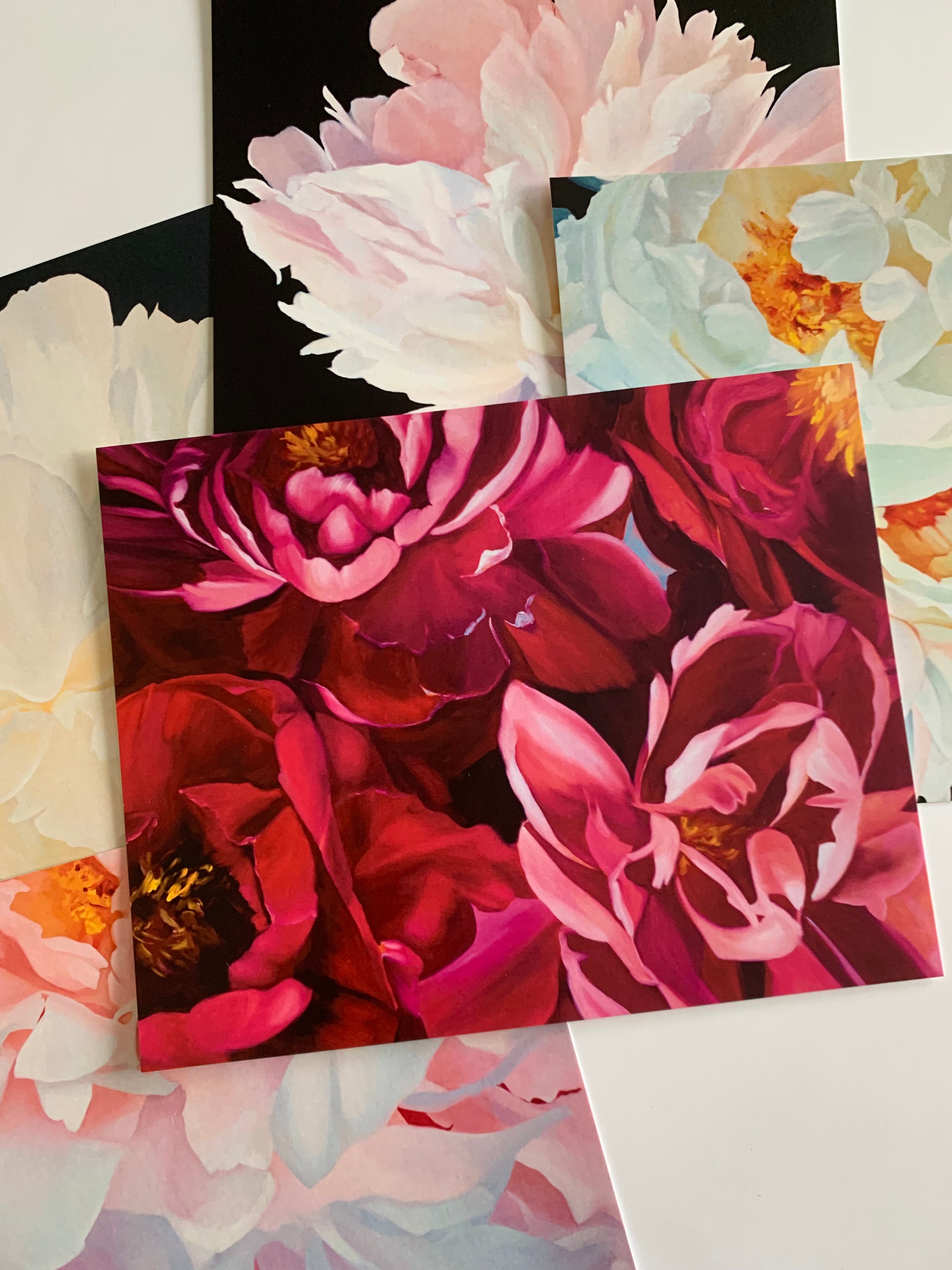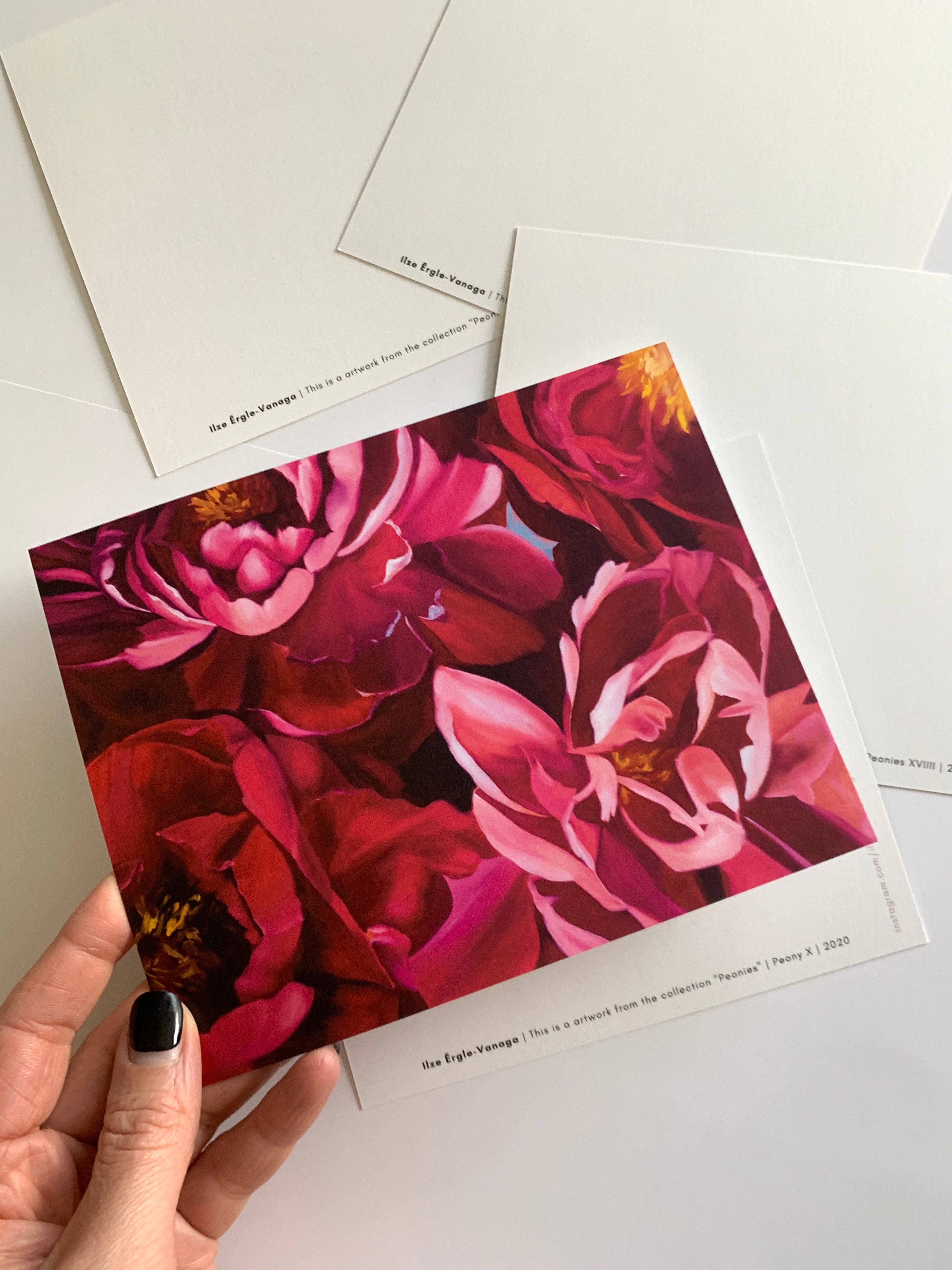 Apsveikuma kartiņas ar peonijas gleznas reprodukcija no izstādes "Iegrimt peoniju burvībā".