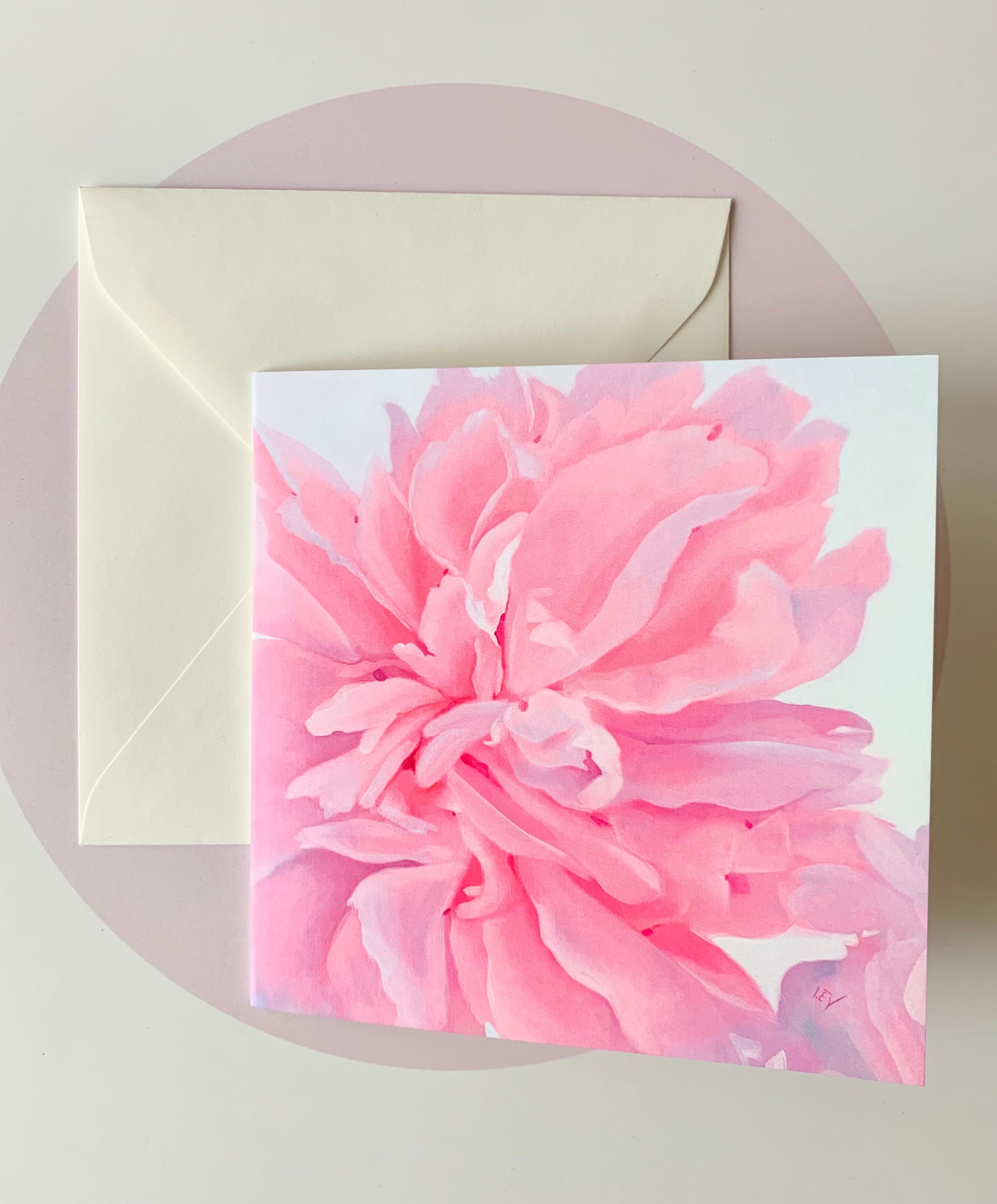Atverama apsveikumu kartiņa ar peonijas gleznas reprodukciju no izstādes "Iegrimt peoniju burvībā".