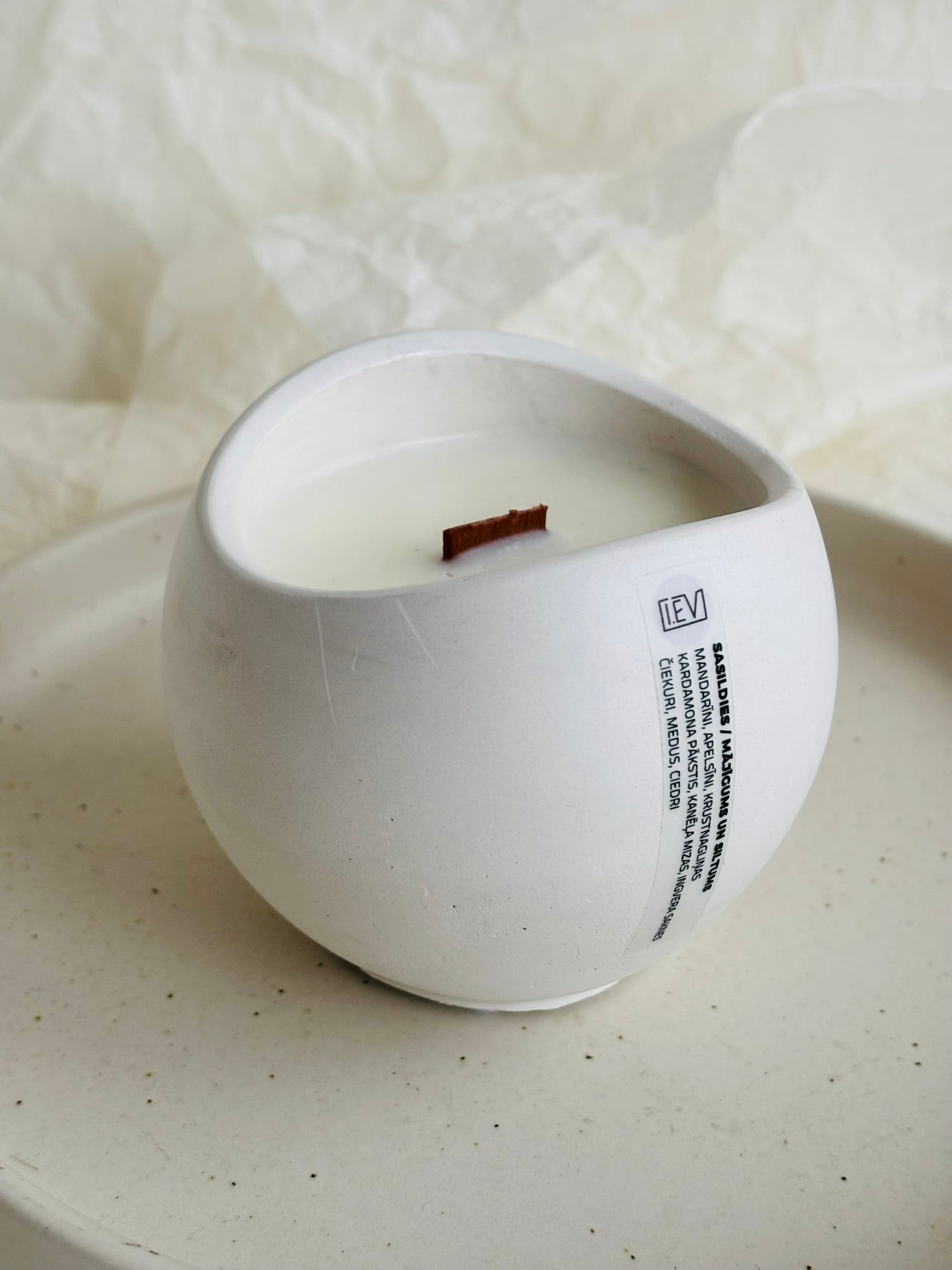 samržīgā sojas vaska sveces ar koka dakti baltā ģipša traukā, sveces īpašiem dzīves mirkļiem, aromātiskās sveces, dabīgās sveces, dabīgās vaska sveces, Sveces ražotas latvijā, sveces roku darbs, aromatizētas sveces, sveces dāvanai, sveces dzimšanas dienai, sveces ziemassvētkiem, Aromātiksā sojas vaska svece Mīlestības ābols Ilze Ērgle-Vanaga