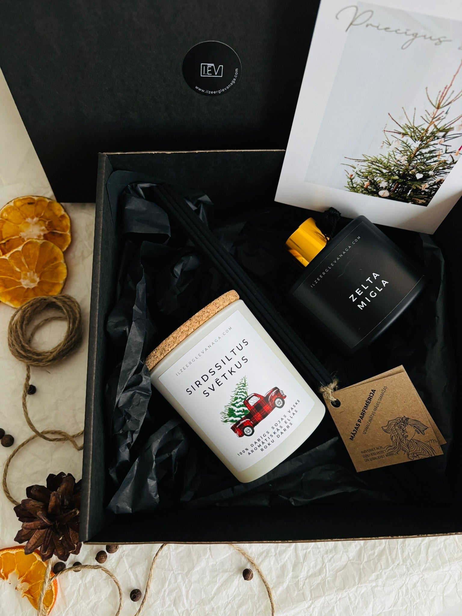 Dāvanu komplekts ir iesaiņots melnā zīdpapīrā melnā dabai draudzīgā kartona kastē ar apsveikuma kartiņu Priecīgus svētkus.