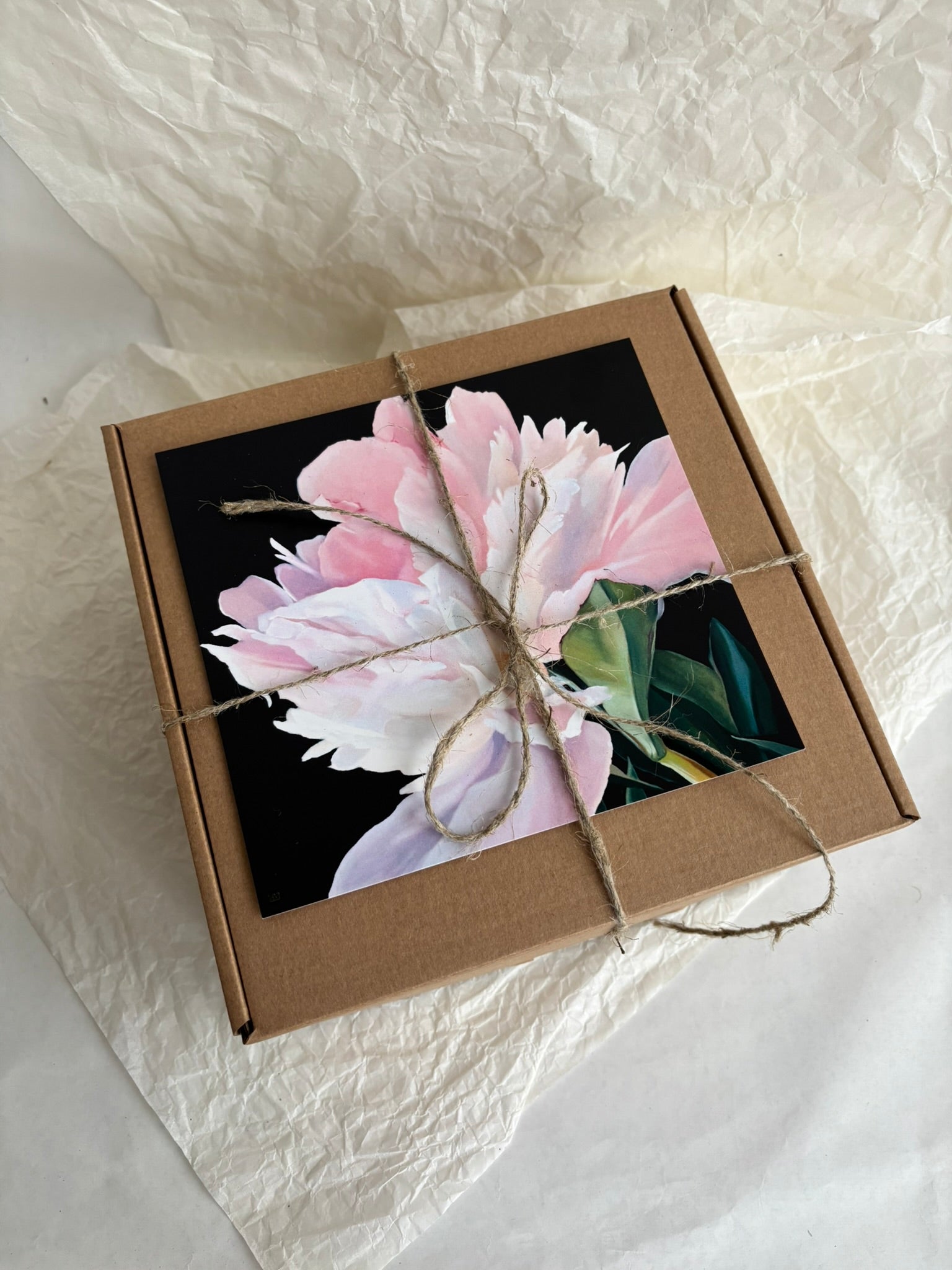 Dāvanu komplekts ir iesaiņots melnā zīdpapīrā brūnā dabai draudzīgā kartona kastē ar mākslinieces Ilzes Ērgles-Vanagas kartiņu gleznu Peoniju ziedu reprodukciju.