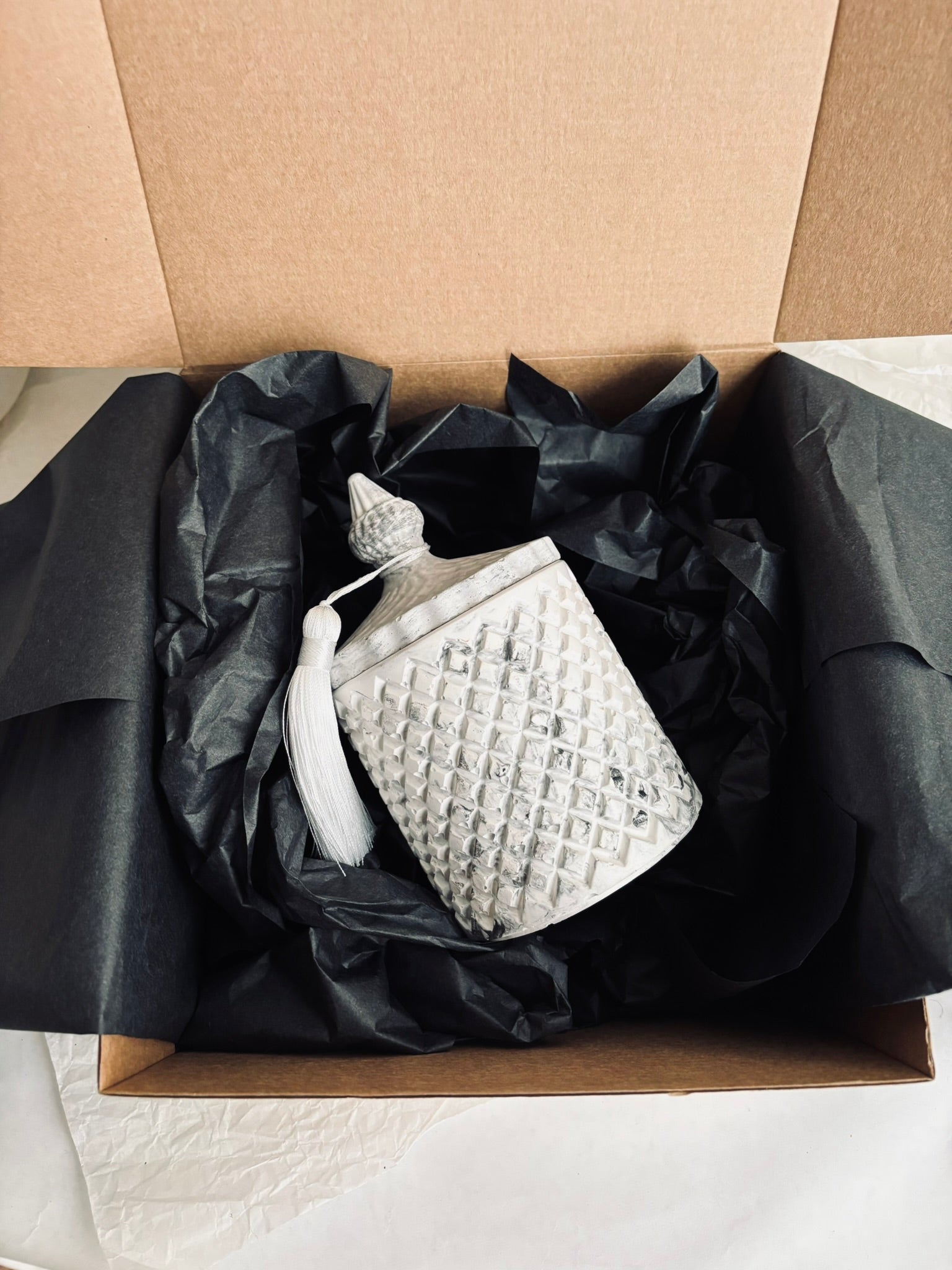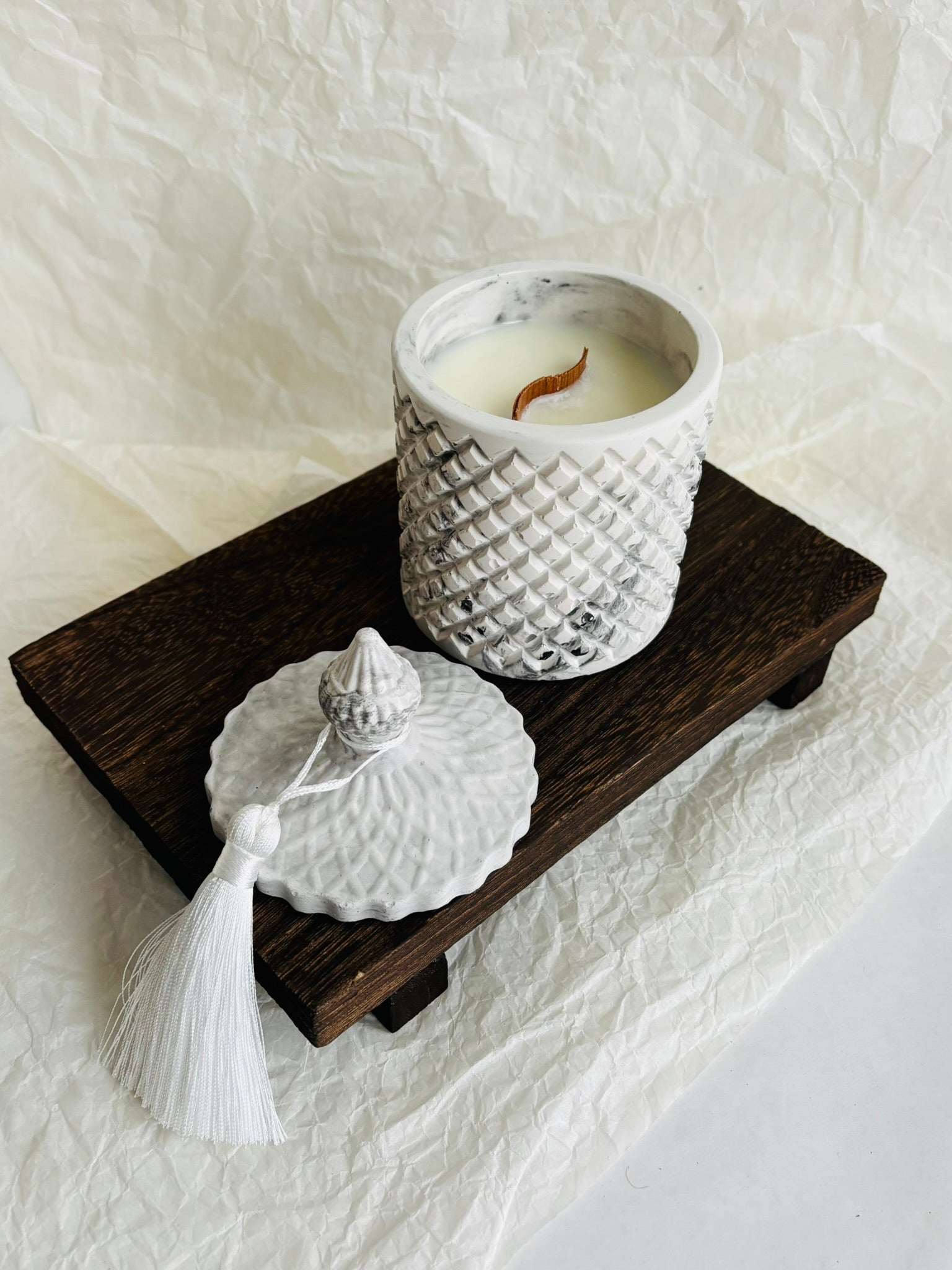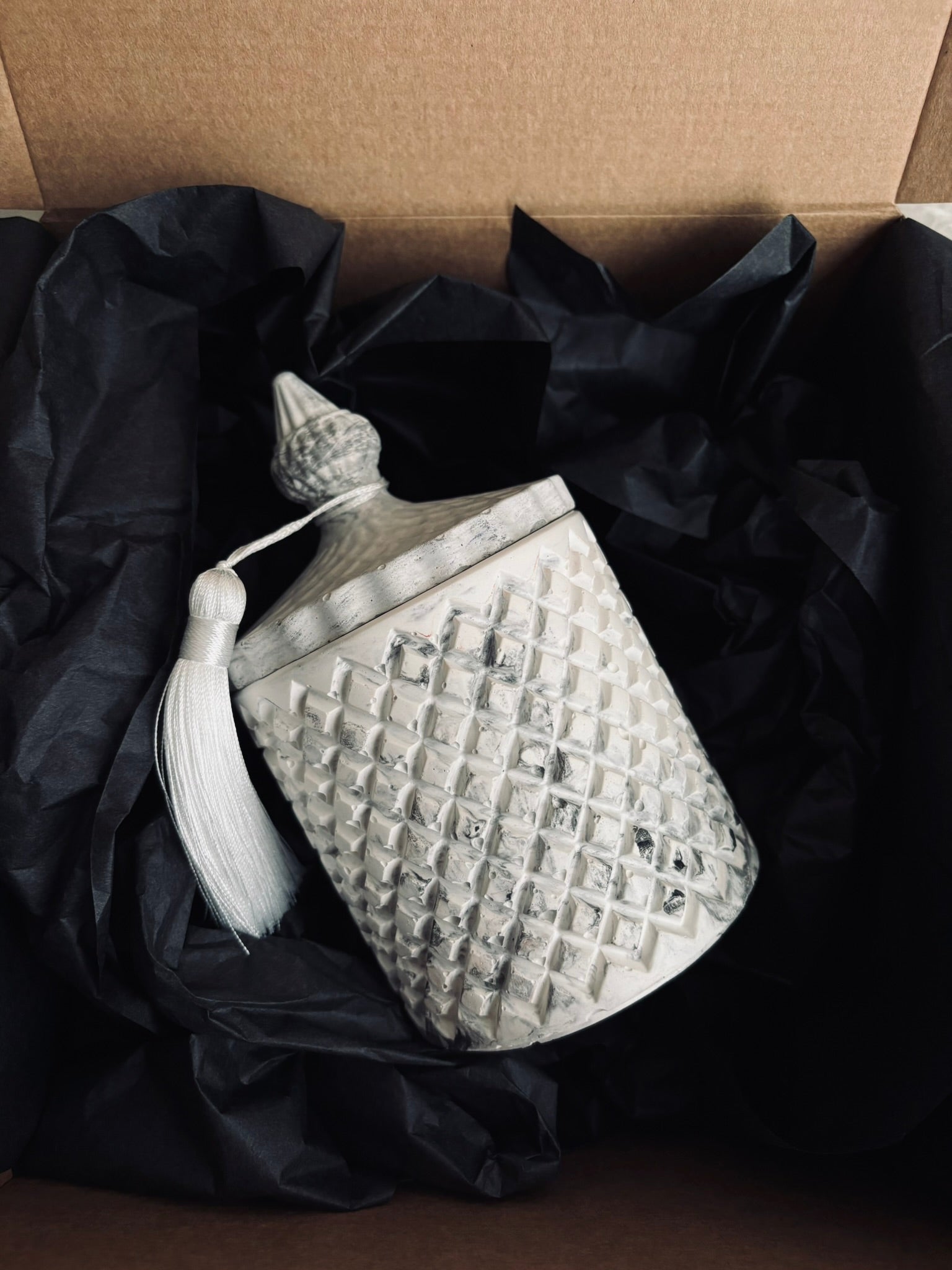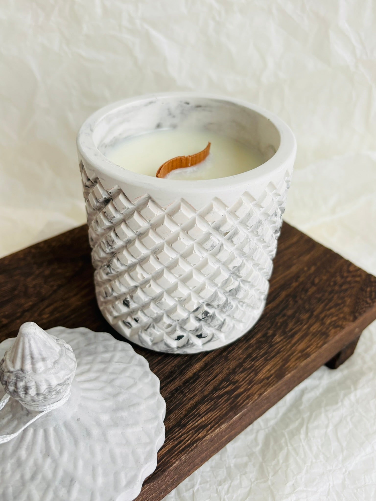 Izsmalcināta, ar mīlestību radīta svece, kas apvieno eleganci, dabiskumu un siltumu. Katrs trauks ir 100% roku darbs, veidots no ģipša ar unikālu marmora rakstu, kas piešķir tam īpašu raksturu un neatkārtojamību.