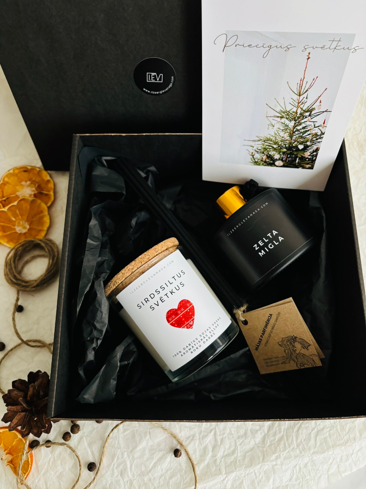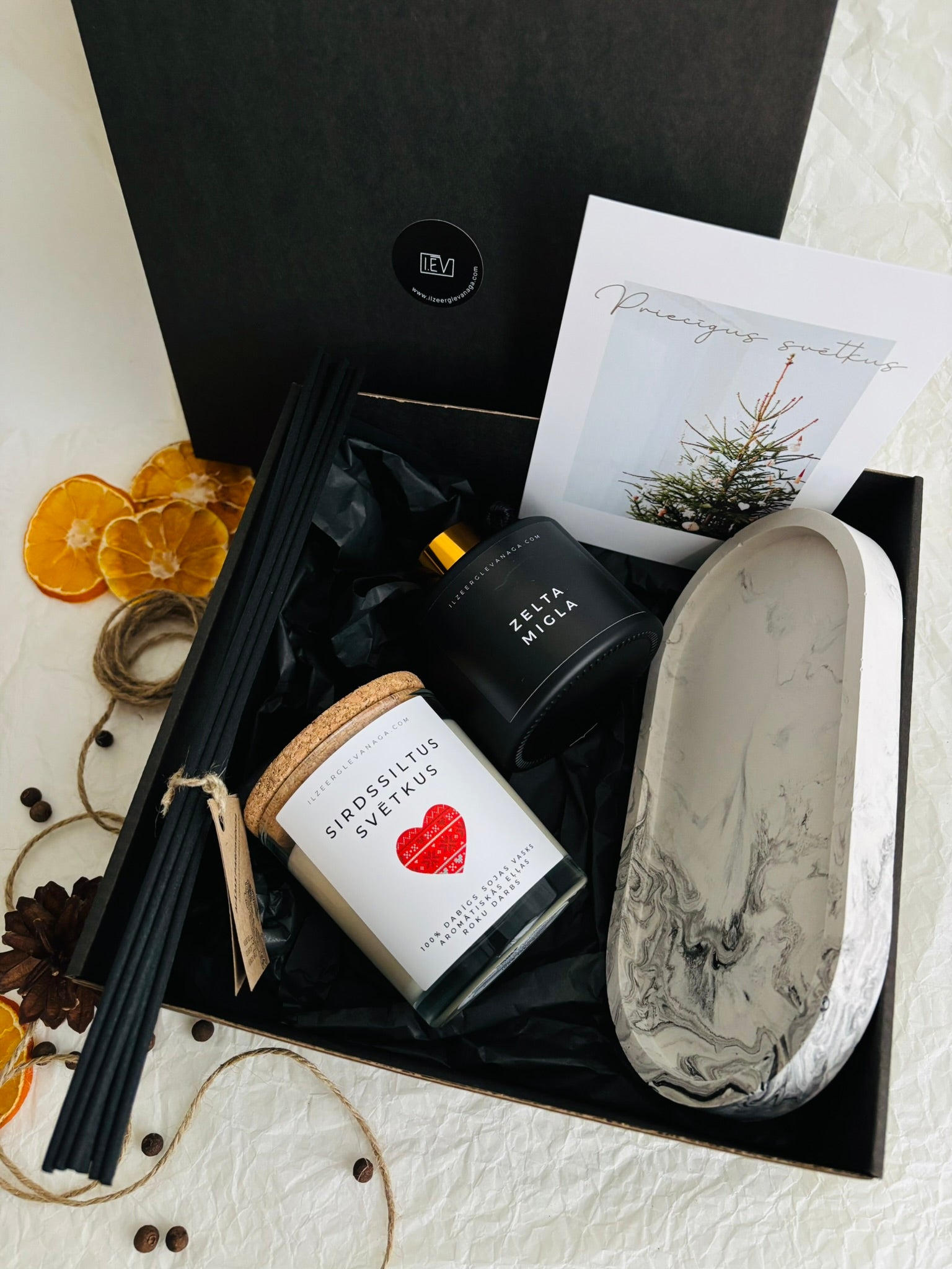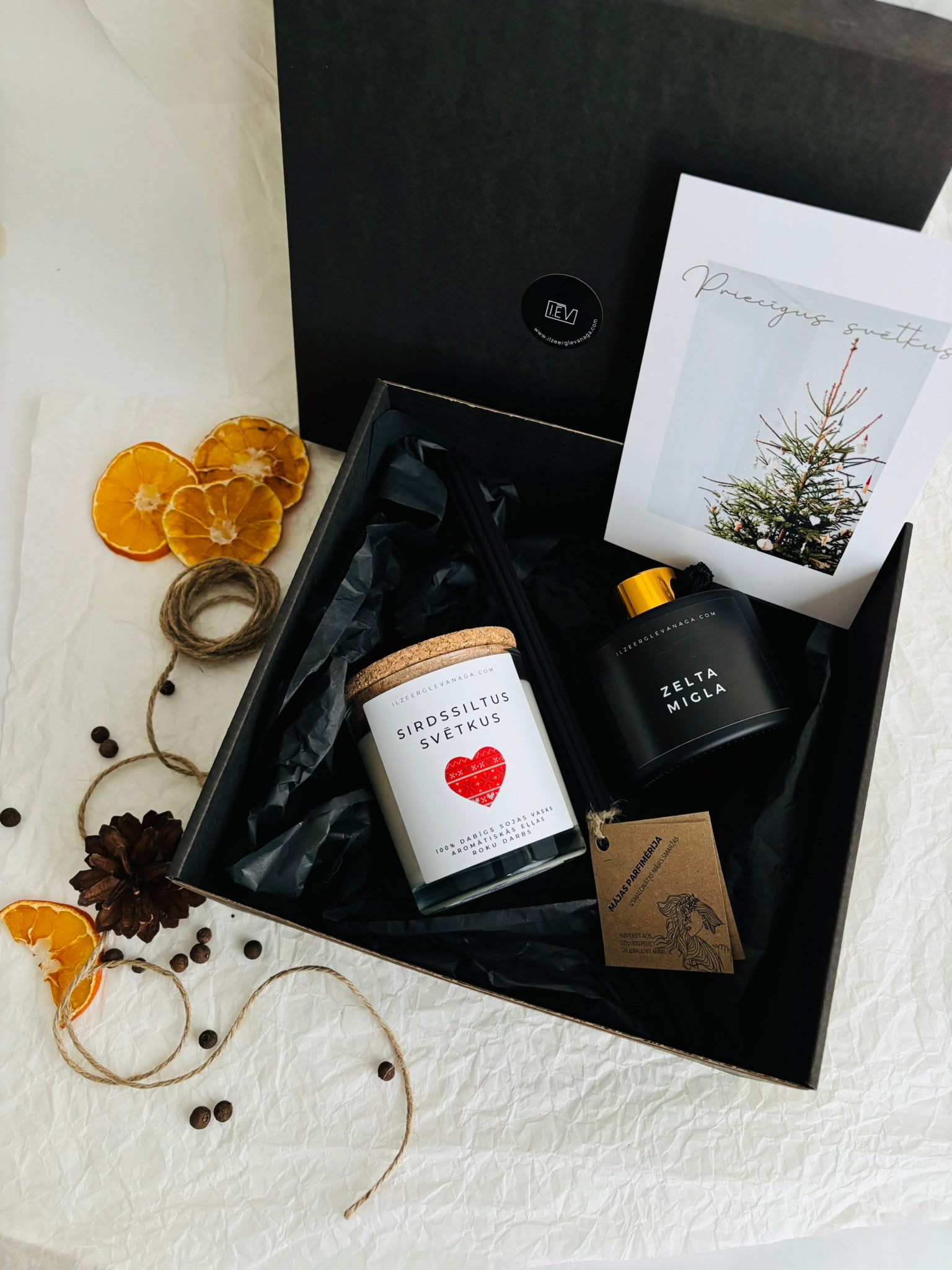 Dāvanu komplekts ir iesaiņots melnā zīdpapīrā melnā dabai draudzīgā kartona kastē ar apsveikuma kartiņu Priecīgus svētkus.