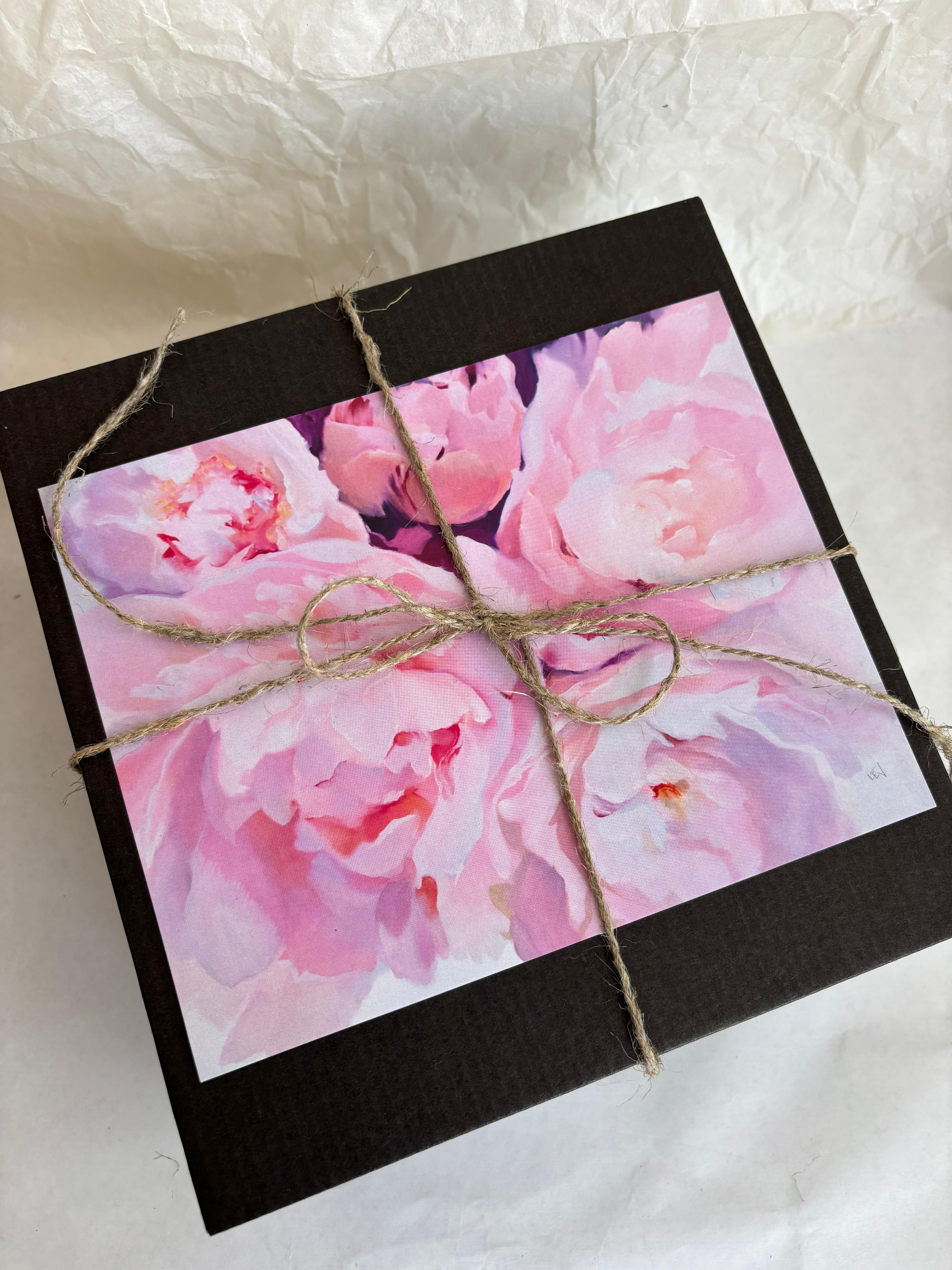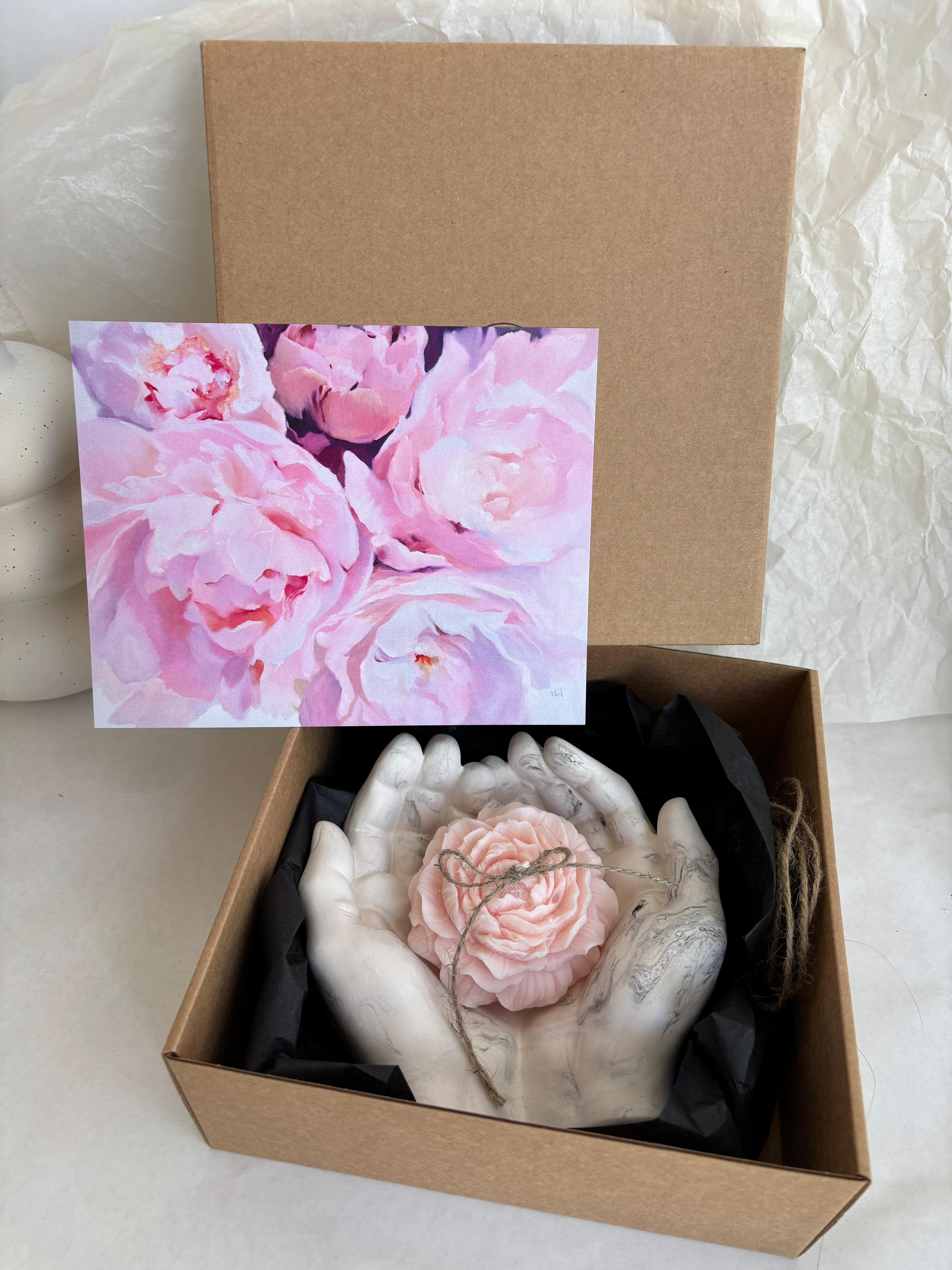 AROMĀTISKĀ VASKA SVECE AR ZIEDU BALTĀ DĀVANU KASTĒ | PEONIJAS APSKĀVIENS