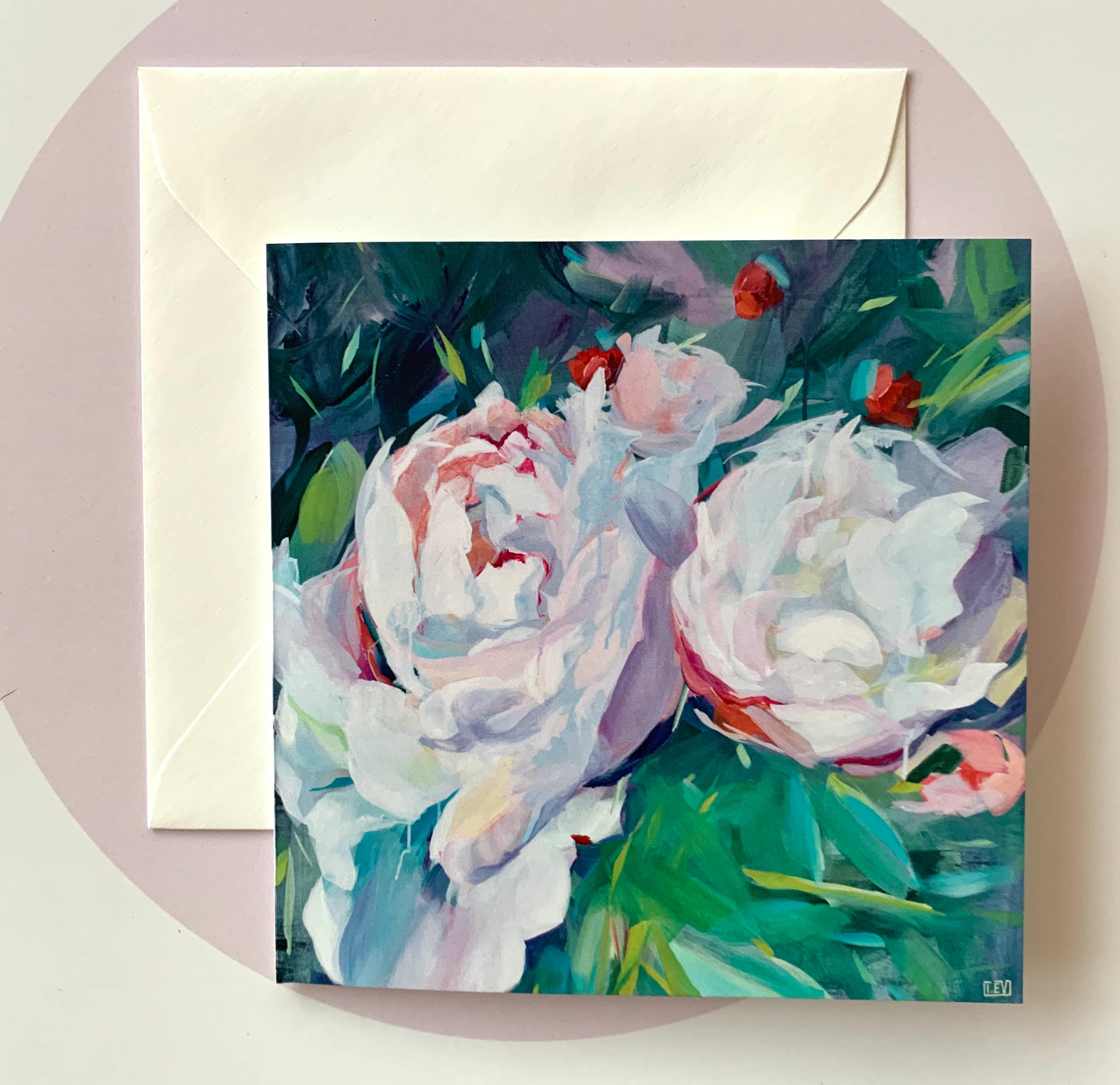 Atveramā apsveikuma kartiņa ar peonijas gleznas reprodukciju no izstādes "Iegrimt peoniju burvībā".