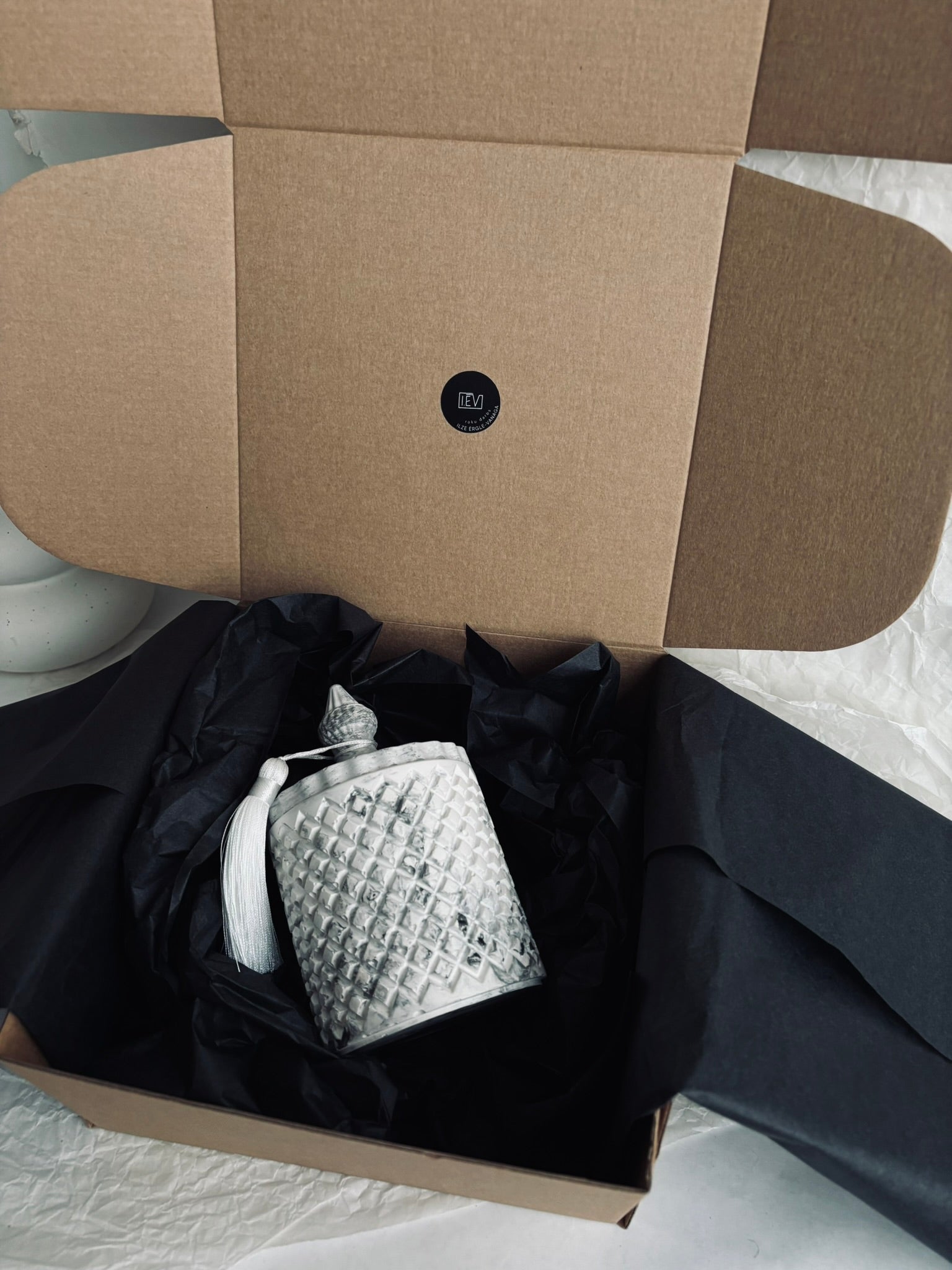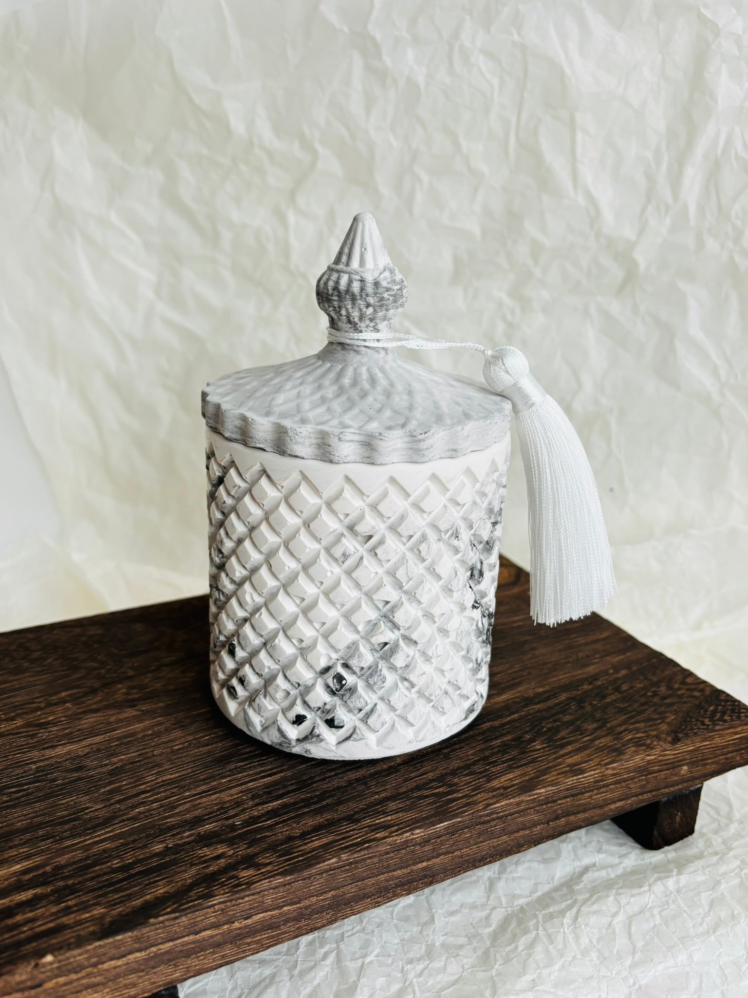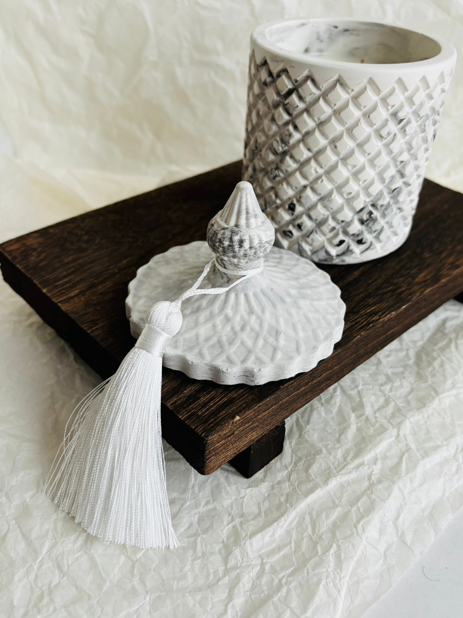 Izsmalcināta, ar mīlestību radīta svece, kas apvieno eleganci, dabiskumu un siltumu. Katrs trauks ir 100% roku darbs, veidots no ģipša ar unikālu marmora rakstu, kas piešķir tam īpašu raksturu un neatkārtojamību.