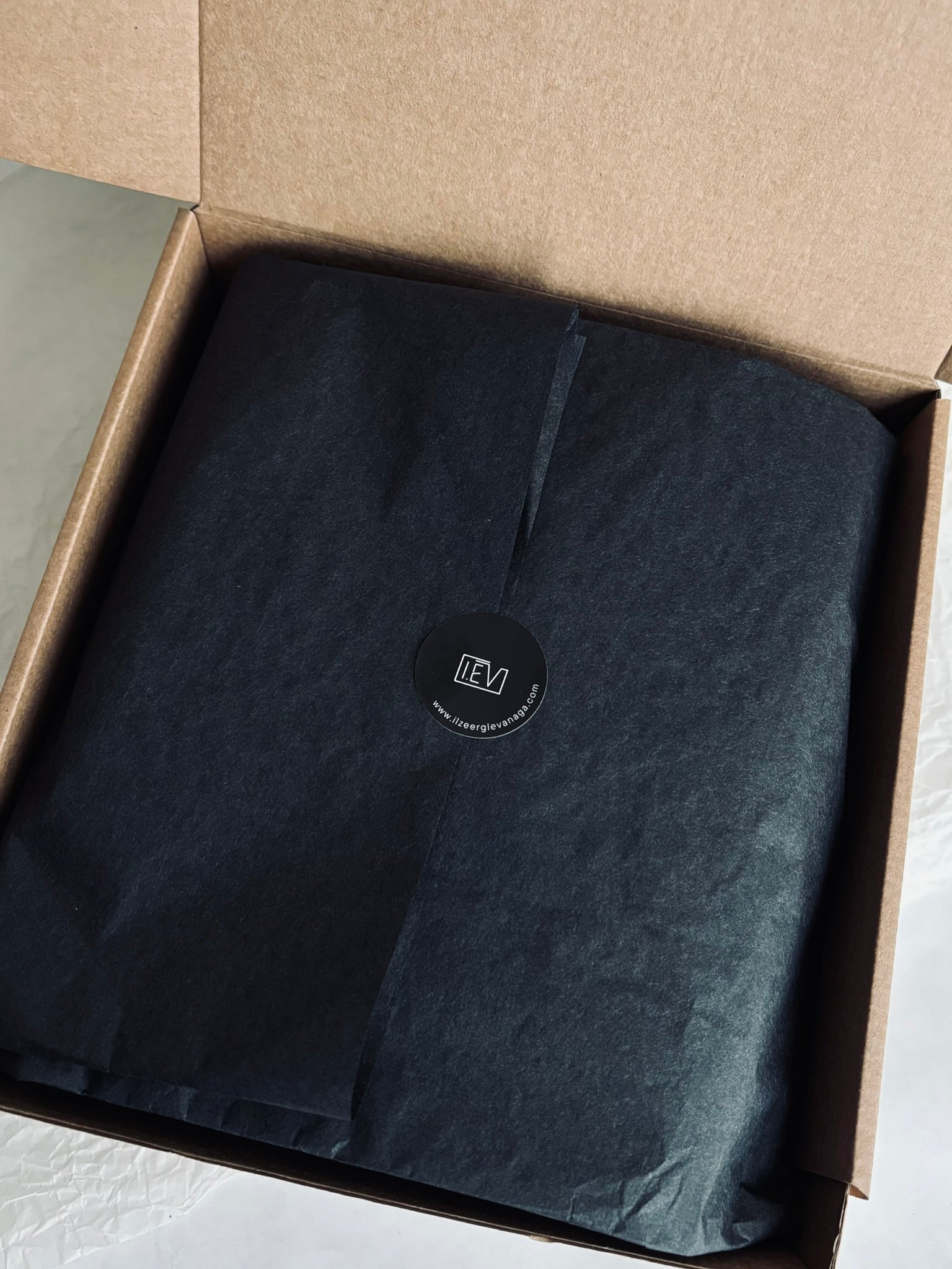 Dāvanu komplekts ir iesaiņots melnā zīdpapīrā brūnā dabai draudzīgā kartona kastē ar mākslinieces Ilzes Ērgles-Vanagas kartiņu gleznu Peoniju ziedu reprodukciju.