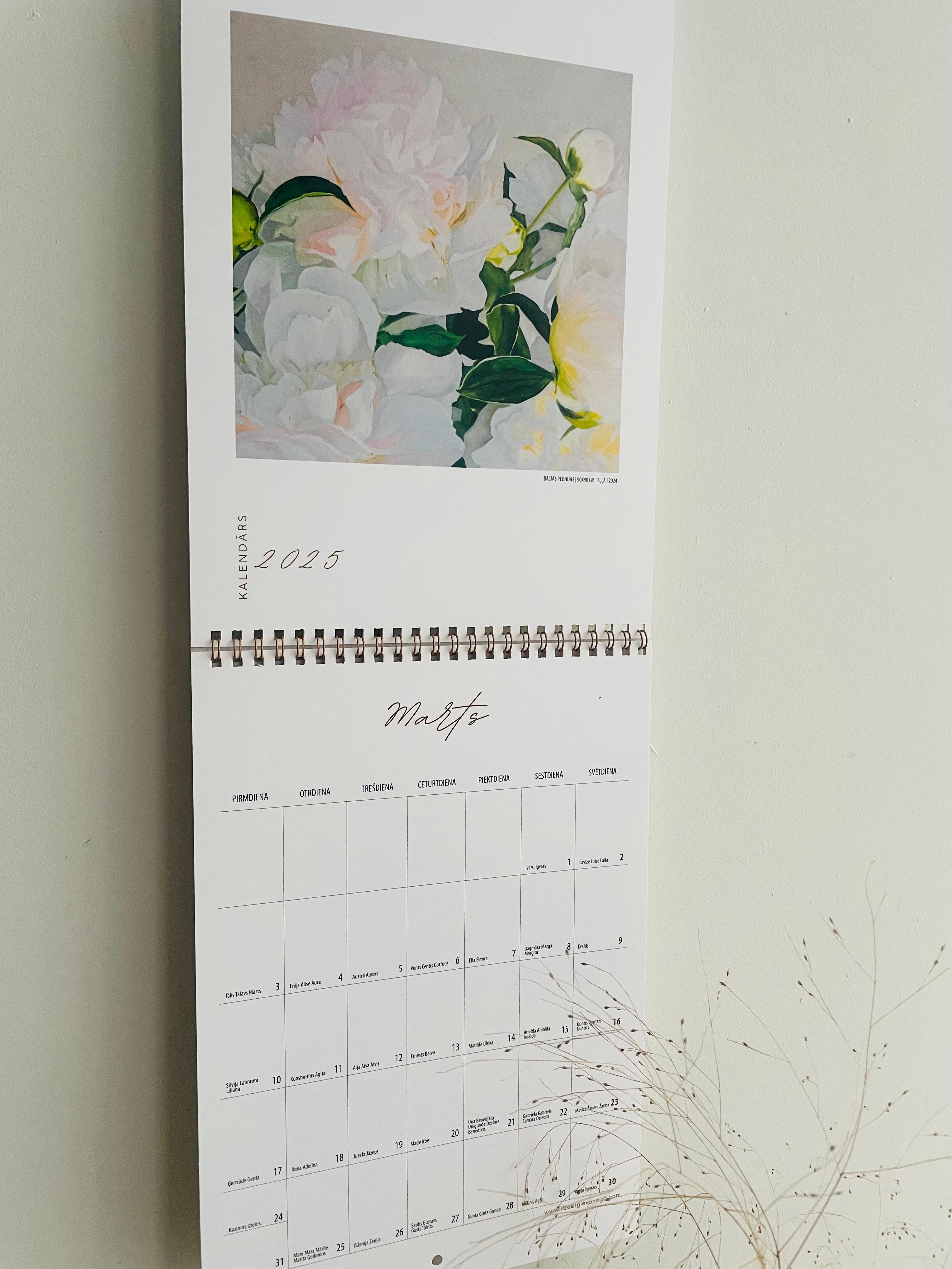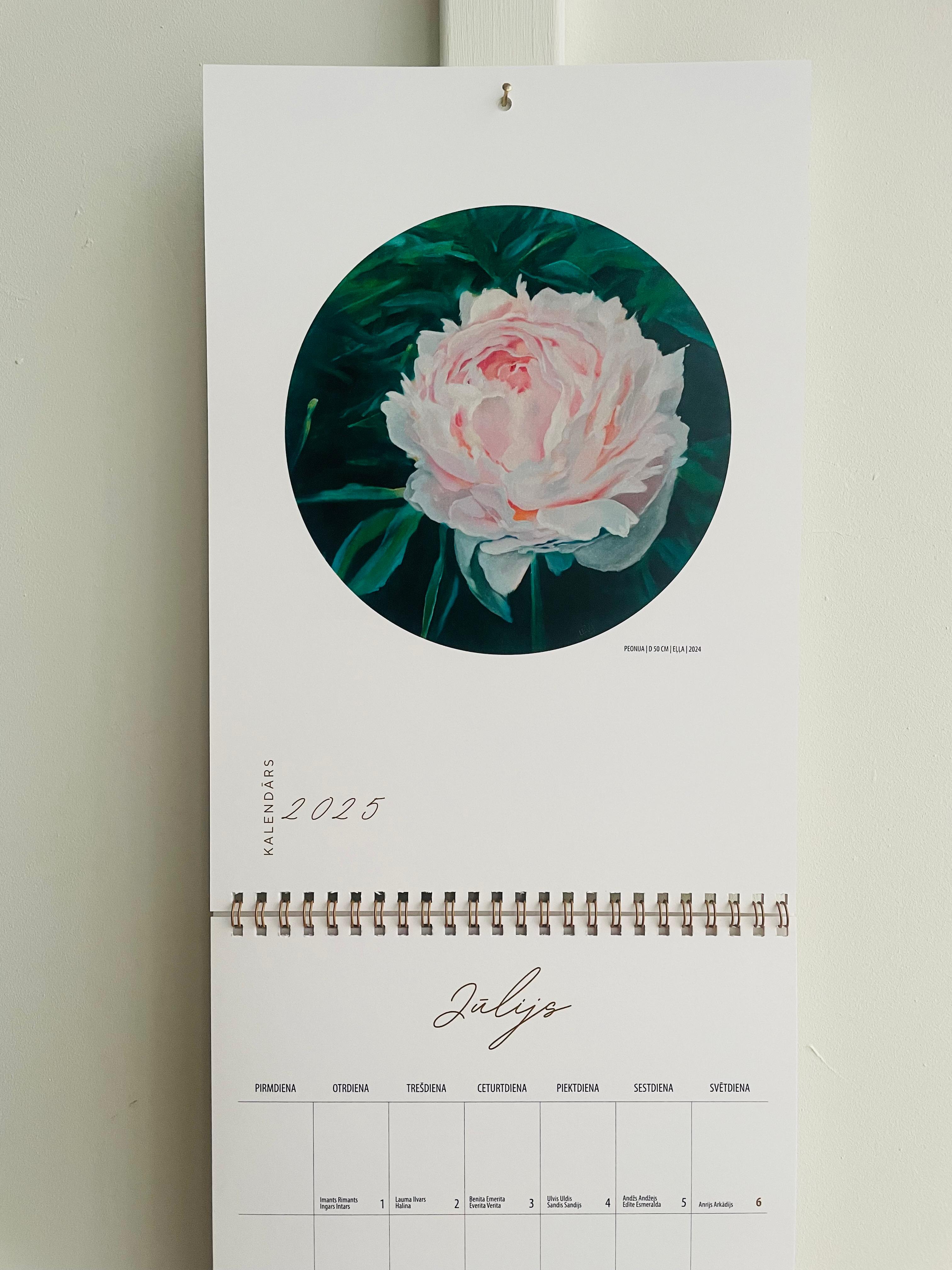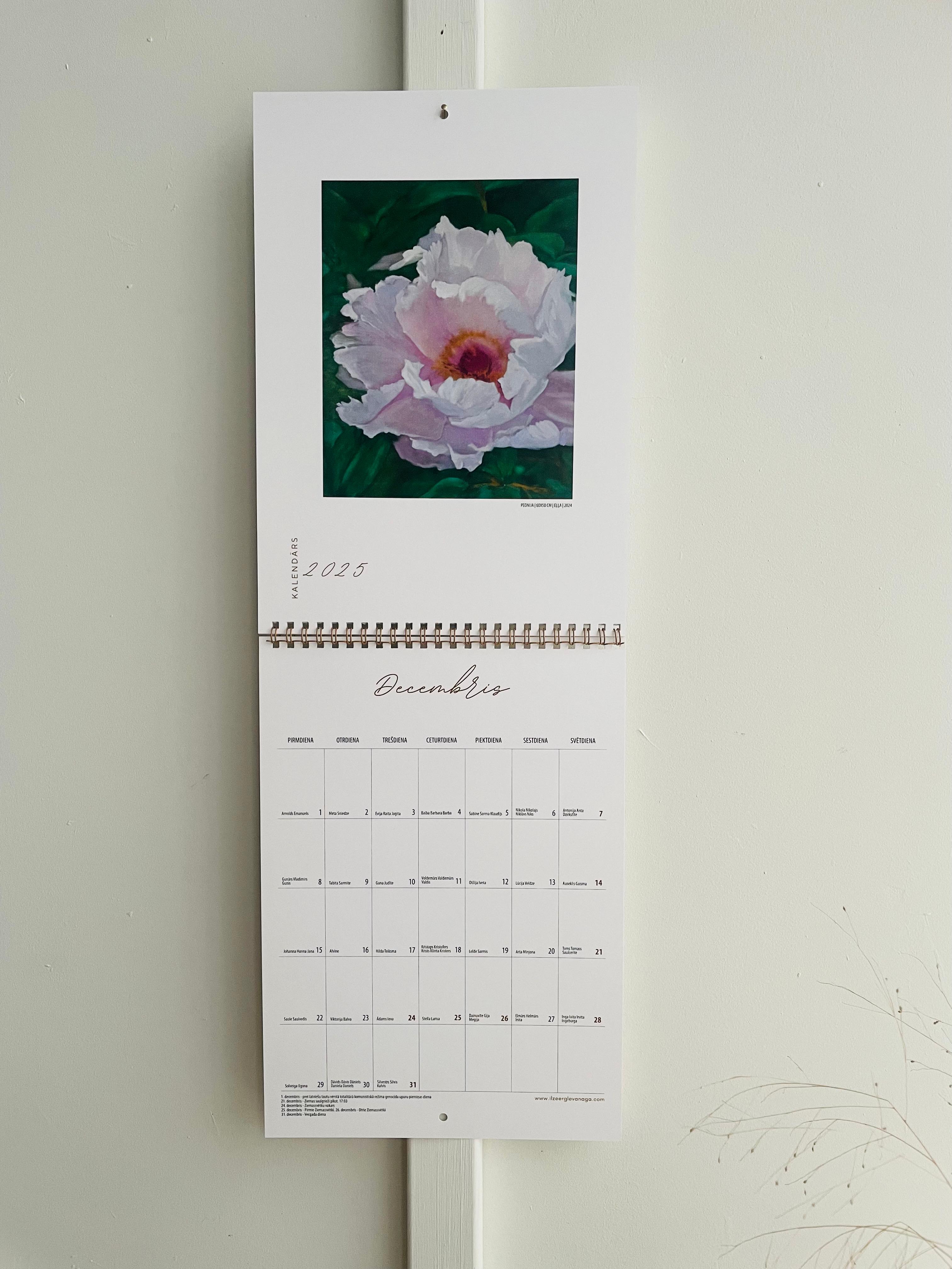 Kalendārā katru mēnesi ir redzama gleznu reprodukcija no gleznu kolekcijas "Peonijas".
