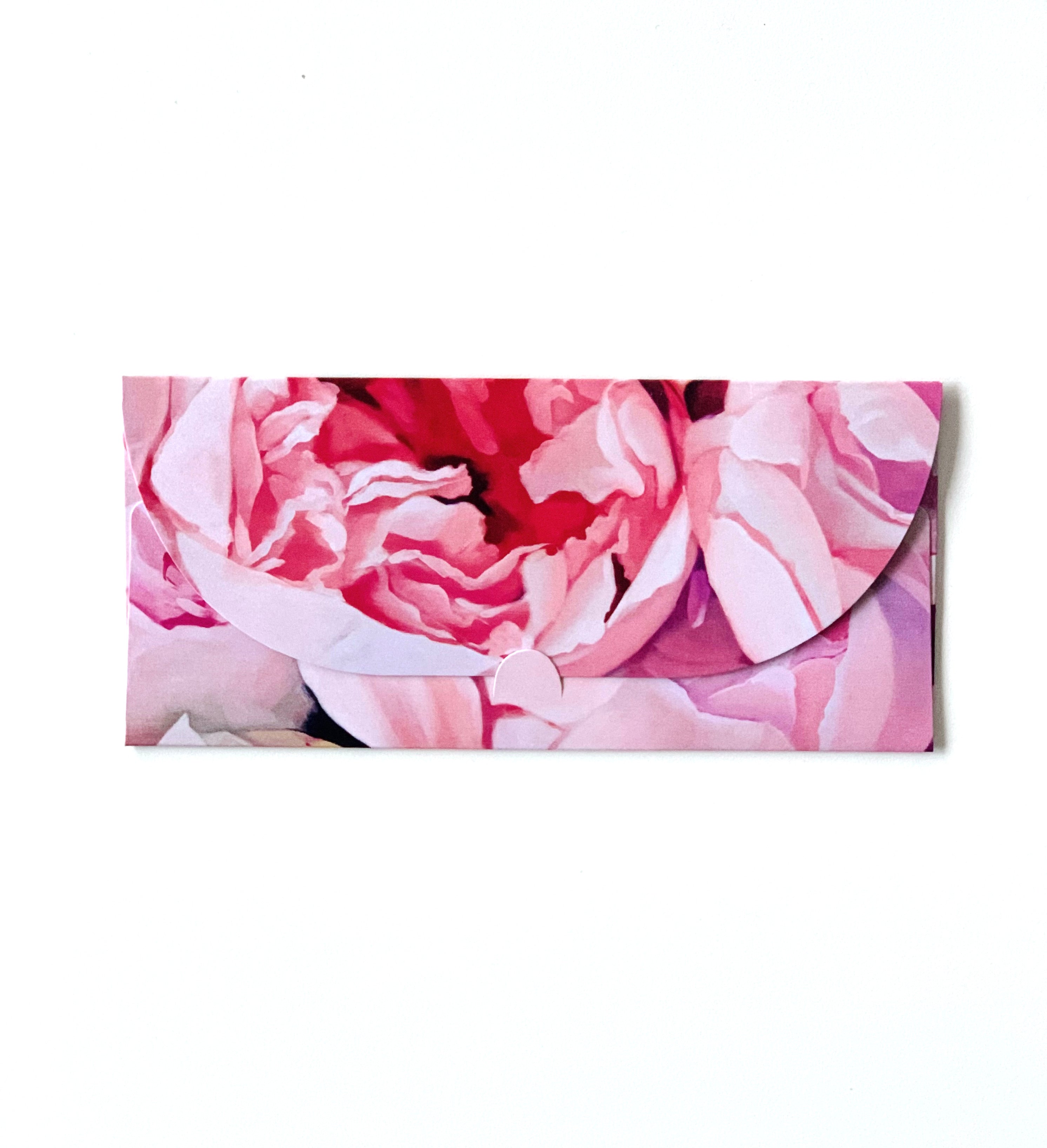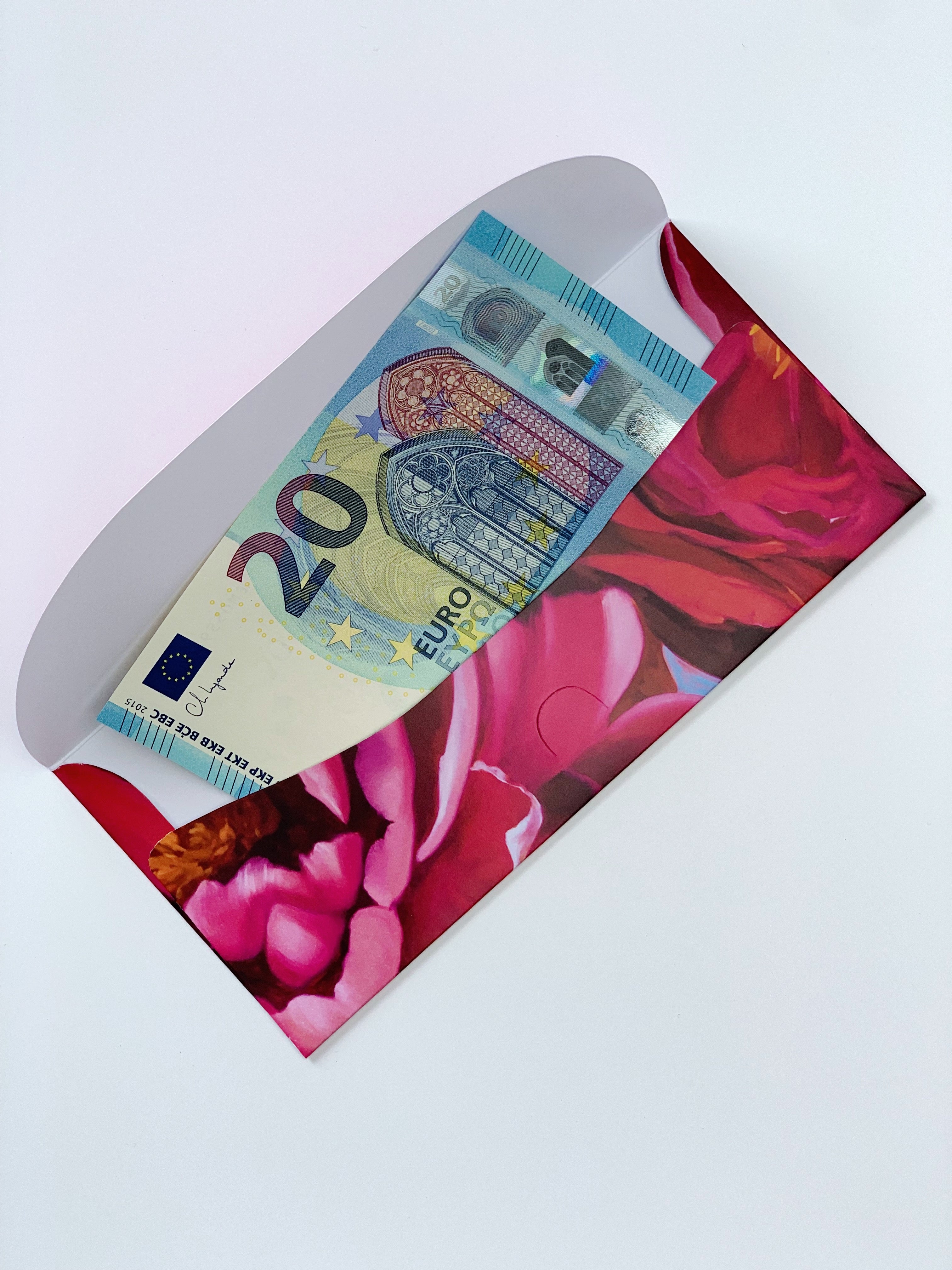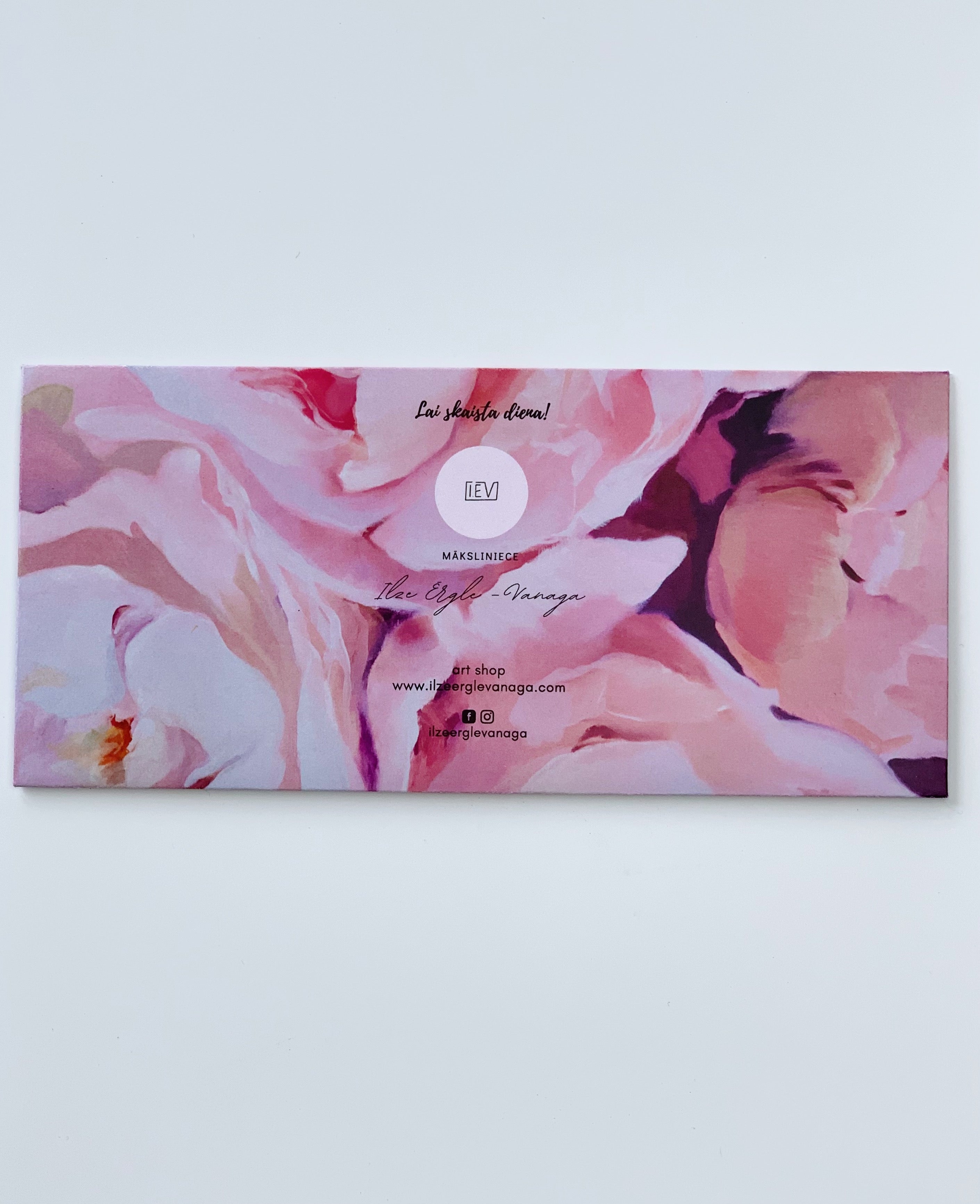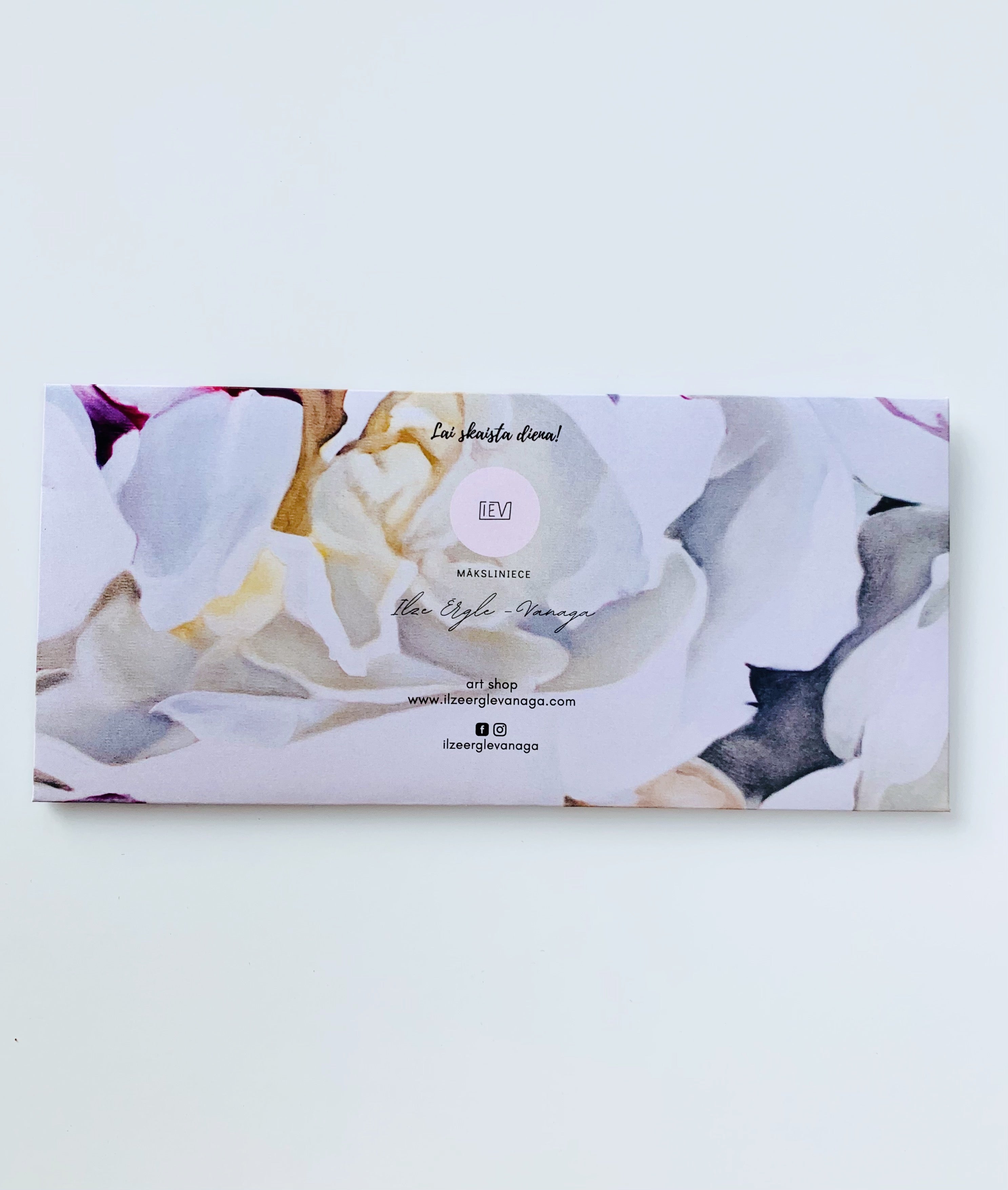 Naudas dāvanu aploksne ar peonijas gleznas reprodukciju no izstādes "Iegrimt peoniju burvībā".