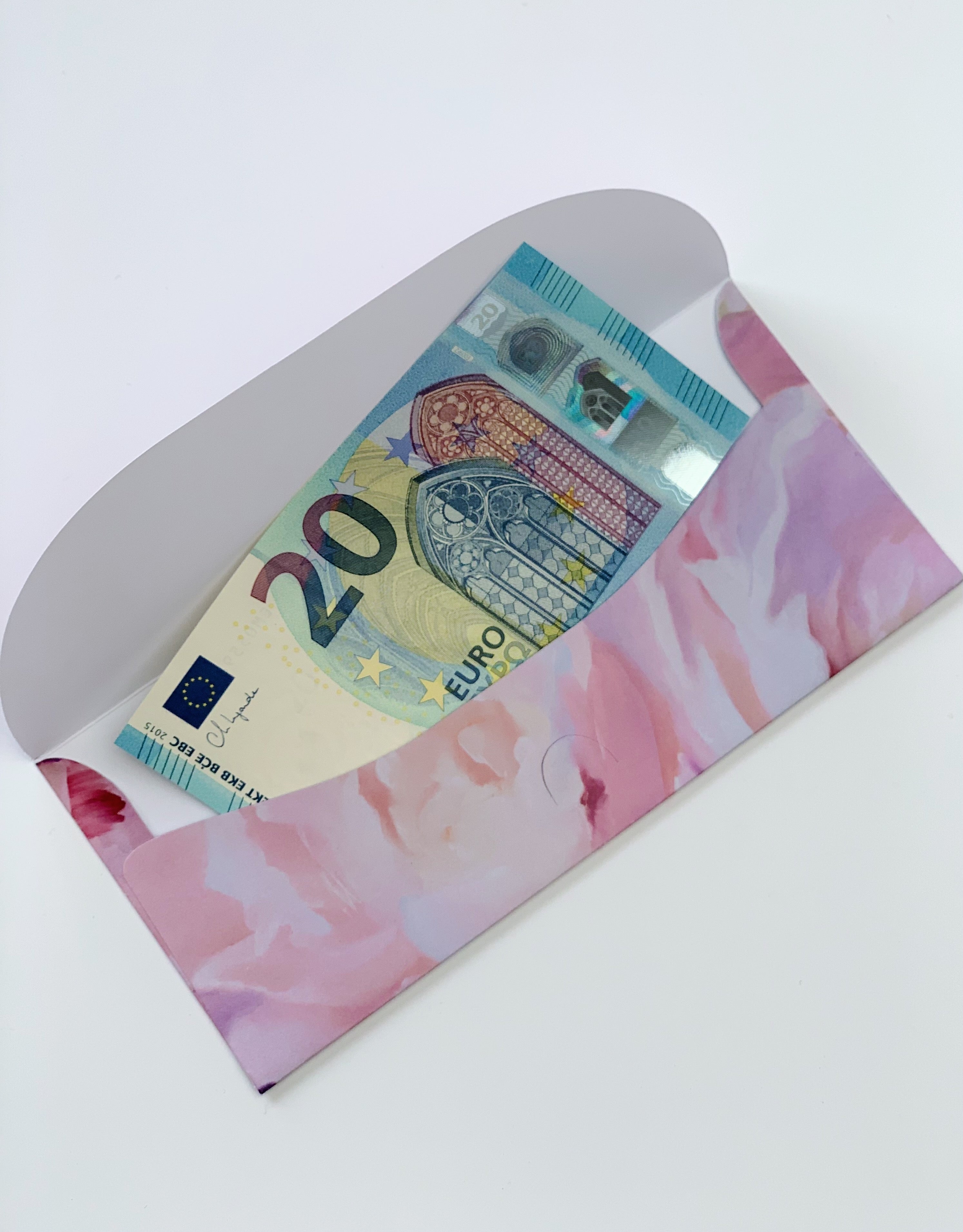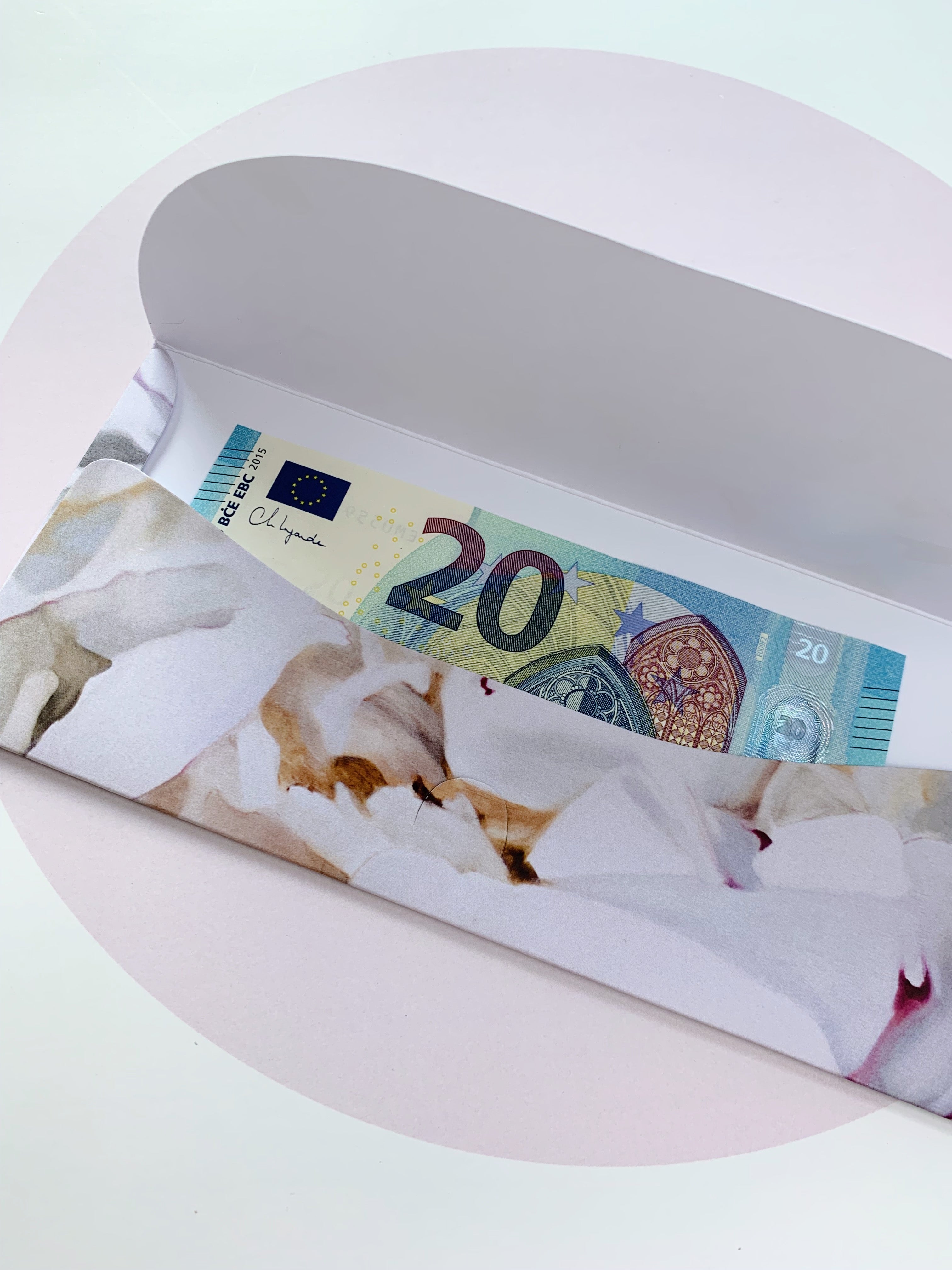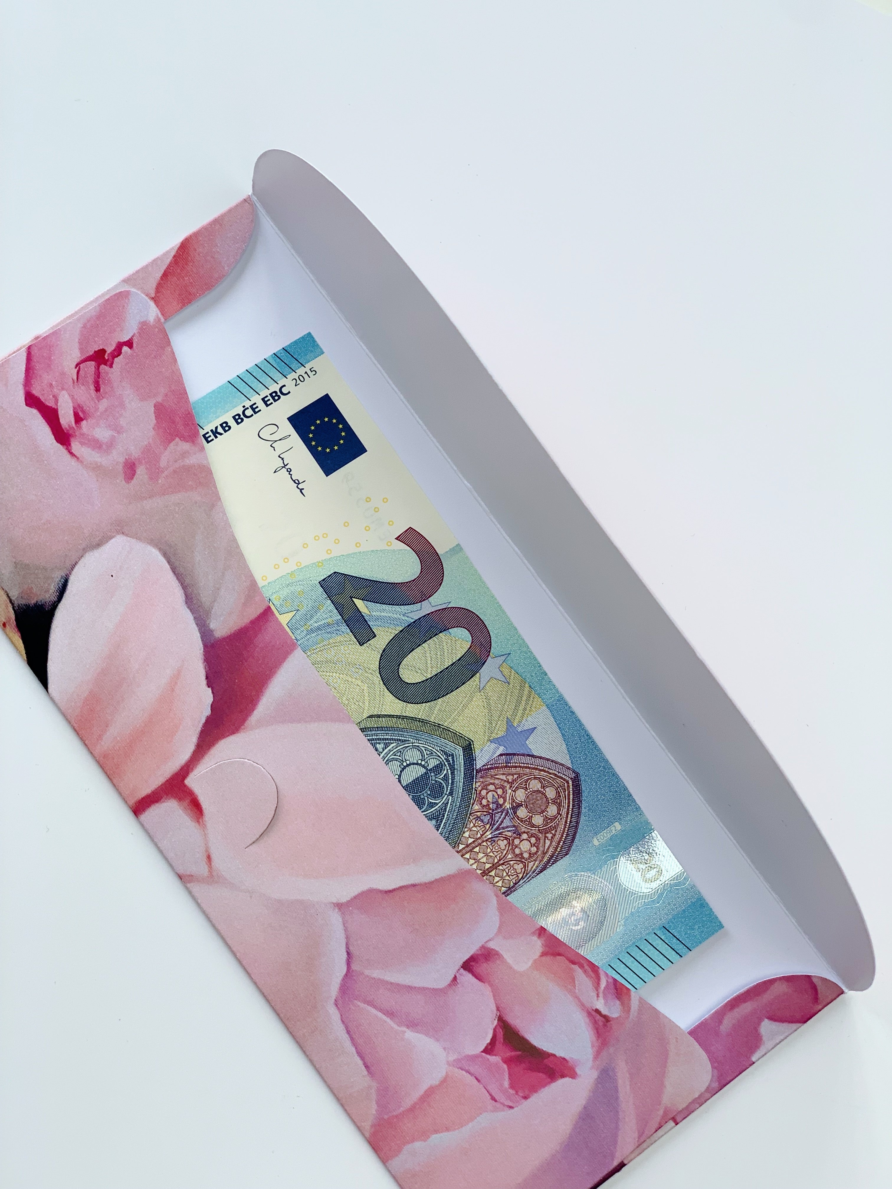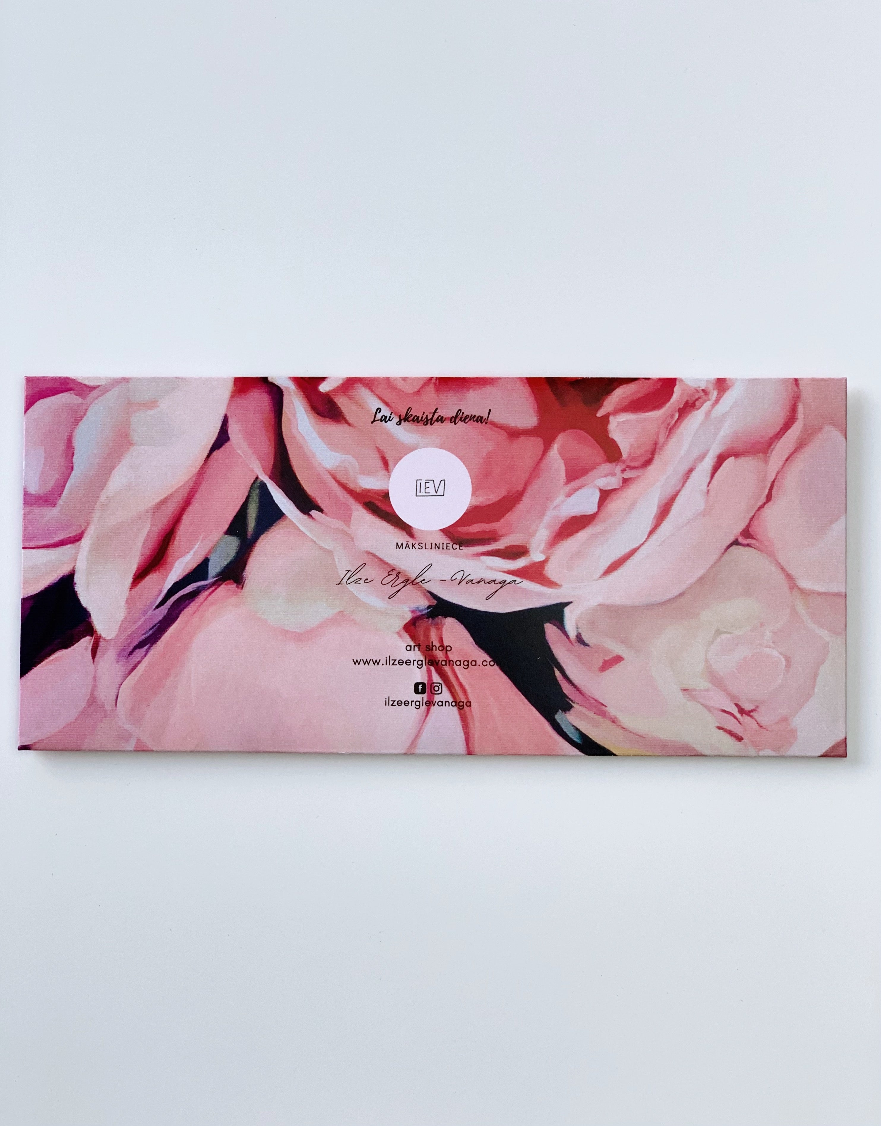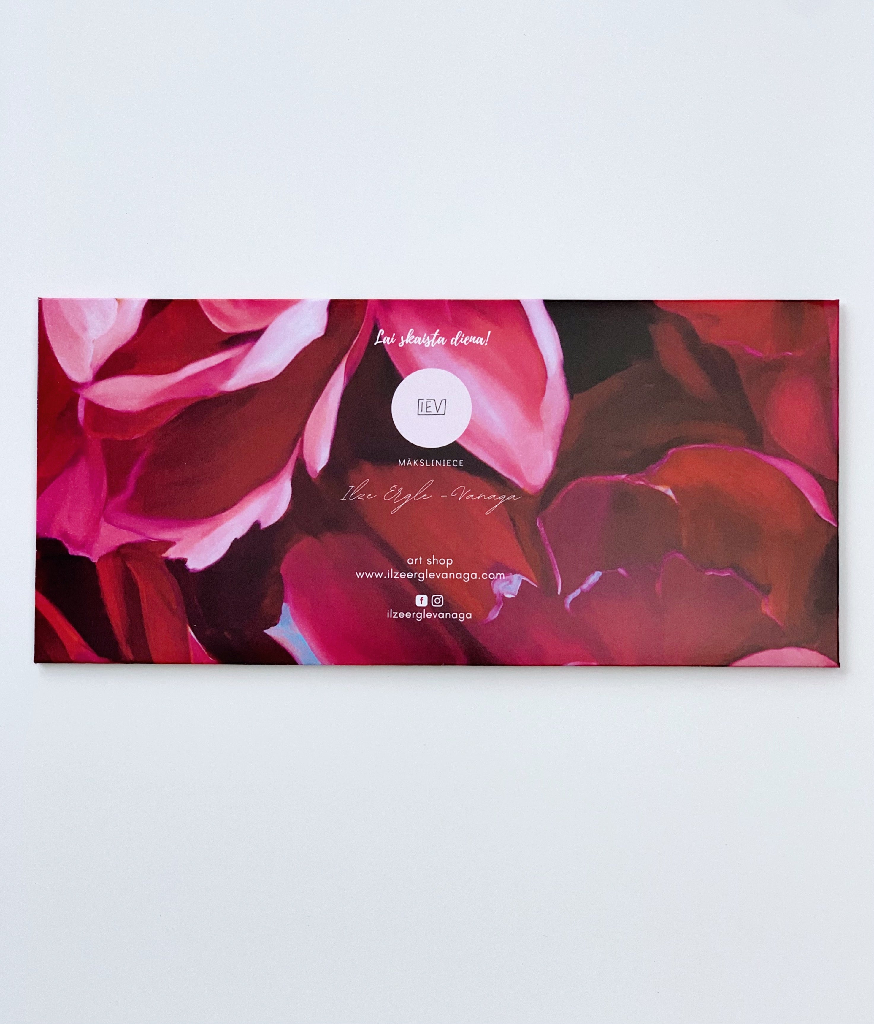 Naudas dāvanu aploksne ar peonijas gleznas reprodukciju no izstādes "Iegrimt peoniju burvībā".