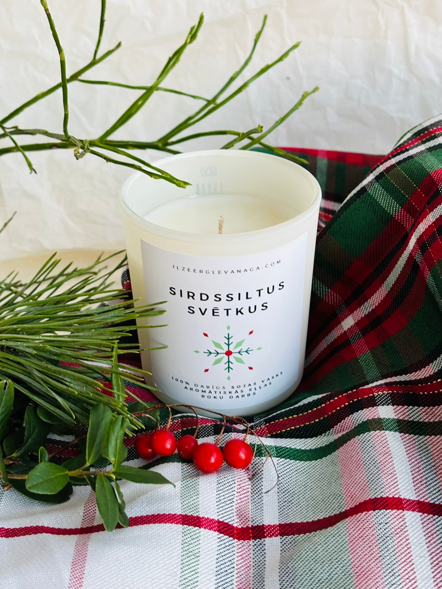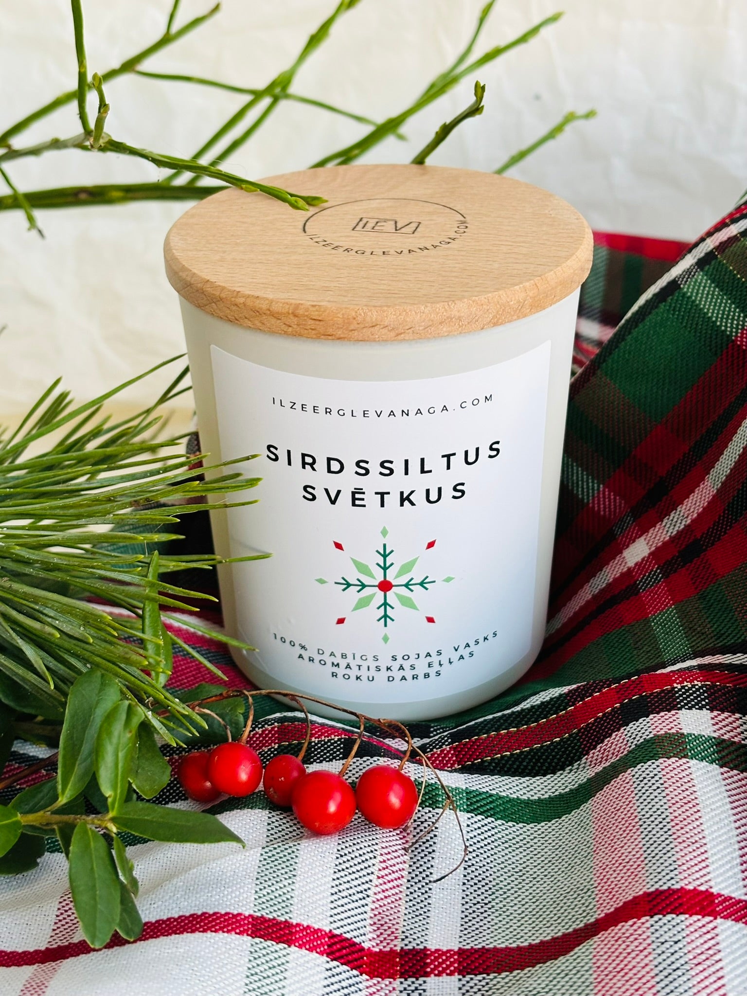 Ziemassvētku svece, kas piepilda mājas ar svētku sajūtu un siltu gaismu. Tā ienes meža svaigumu un eglītes aromātu, bet pieejamie aromāti – mandarīni, kanēļa miza, apelsīni un krustnagliņas – rada īpašu svētku noskaņu. Katrs aromāts ir kā mazs prieka mirklis, kas uzburs mājīgumu, atmiņas par bērnības Ziemassvētkiem un dāvanu gaidīšanas burvību. Mīļa, sirsnīga un iedvesmojoša dāvana cilvēkiem, kuri novērtē siltumu un roku darbu skaistumu.